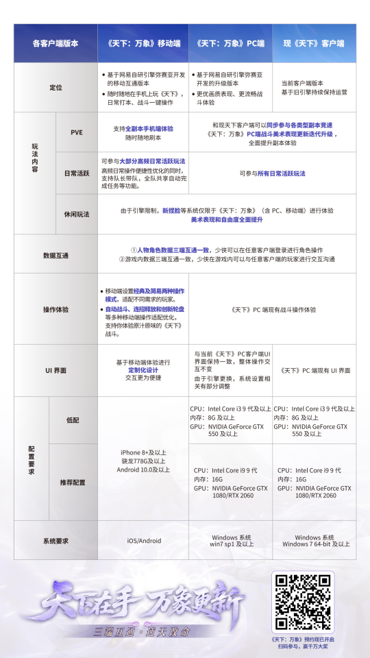 要说这两天大家讨论度最高的内容,必然是《天下:万象》无疑。因为就在昨日,我们为大家带来了网易首款3DMMO《天下》将全面升级为《天下:万象》的重磅消息——除了现有的《天下》客户端,还将新增《天下:万象》移动端、《天下:万象》PC端,并且在这三个客户端中实现完全的数据继承、互通,让你随时随地、用不同的工具,都能畅游天下! 目前,对于《天下:万象》的预约已经全面铺开,如果你还没找到途径前往预约,不妨点击文末【阅读原文】直达详情界面哦!需要向大家说明的是,本次预约自昨日开始,将一直持续到《天下:万象》正式上线。具体的上线时间请留意后续的官方通知哦~参与预约可以即刻获得随机金额的现金红包一份,最高可暴击888元,心动不如行动! 对于即将上线的《天下:万象》,我们已经收集到了不少疑问和各类资讯,今天将为大家进行一次统一的解答,事不宜迟,赶快下滑看看吧~ 关于《天下:万象》的疑问? 我来为你一一解答! 少侠:《天下:万象》H5活动奖励是所有服务器都能领的吗? 开发组:没错!没有服务器限制,少侠在万象客户端登录即可领奖励!《天下:万象》上线后,少侠可自行选择预约所用账号在天下3/天下贰(包含年度服【弱水三千】/《天下贰·经典版》)的所有服务器中,任选其中1个服务器下的1个角色领取抽奖奖励,同一账号仅可领取1次。 奖励将通过万象端NPC-万象预约大使进行发放,少侠登录万象客户端即可进行领取。 少侠:《天下:万象》PC端是什么?跟现在的开天客户端的关系是? 开发组:在《天下:万象》正式上线后,当前的开天客户端将正式升级为《天下:万象》PC端。少侠可以把当前开天客户端版本看作为一个“前瞻版”,可以进行先行体验哦! 当前,开天赠礼活动进行中,少侠使用开天客户端每日登录即可获得一次抽奖机会,参与抽奖即有机会获得升龙变礼盒等好礼~ 少侠:【三端互通】是什么意思?我的角色、时装、装备、元宝都能继承吗? 开发组:三端指的是“PC端、iOS端、安卓端”,《天下:万象》上线后将实现三端数据的实时互通,无论您从哪个端口登录《天下》,所有的个人角色数据(包含了所有账号角色内资产)都将互通。 少侠:各客户端在玩法内容、操作体验上有什么差异? 开发组:《天下:万象》正式上线后,天下将拥有《天下:万象》移动端、《天下:万象》PC端、现《天下》客户端这三个客户端。 简而言之,《天下:万象》移动端更便捷,在游玩设备上更自由,支持全副本手机端体验,可以参与大部分高频日常活跃玩法,同时也拥有更多对应的便捷性优化。休闲玩法方面,大家最期待的新捏脸系统可以进行体验,美术表现和自由度都有全面的提升。 《天下:万象》PC端和现《天下》客户端在玩法内容、操作上别无二致,但有了新引擎加持的它将在游戏流畅度、美术表现、自由度等有更为卓越的表现,具备现有客户端所不具备的优势,想必能为大家带来更优质的体验! 为方便各位回归少侠了解当前游戏服务器以及对应的客户端选择,我们也制作了对应的表格方便大家明晰相关资讯~ 经典时装升级回归 永久版全员放送! 首先向各位走来的,是经典时装【醉太平】。 【醉思凡】作为它的复刻升级版,不仅完美还原了老版时装的设计,还增添了更多细节,凸显重工外观的华美,女款裙摆上盛开的绝色牡丹、男款衣摆上游走的威武金龙,皆栩栩如生。 以“古典”、“仙气”著称的蒹葭和白露,堪称许多少侠心中的白月光。作为曾经周末喜相逢中的奖励,它也成为了大家每周奋斗的一大动力源泉。 而这一次,基于这款经典时装创作的【秋水寒霜】,想必会成为一代爆款——它延续了蒹葭白露一贯的清冷飘逸,依旧以黑、白为主调,素雅干净,同时增添了水墨感,女装更为出尘脱俗,男装则更似文质彬彬的翩翩公子。 以上两款时装,通过在《天下:万象》界面进行预约,都能直接免费带走!【醉思凡】和【秋水寒霜】更是永久版,一经抽到就能永久拥有! 永久时装【醉思凡】就在本次的预约奖池之内,预约就能参与抽奖,每次抽奖,必定能获得奖池内的任意奖品,让你的期待永不落空~ 奖池内还有各种丰厚奖励,如iPhone17pro、“玉玑子-幻龙蜃影” 1:4正版授权雕像、888现金红包等!还未露面的2025年终纪念礼盒《万象天成》也在本次的奖池里,说不定下一个抽中的就是你,抢先拥有尚未发售的盒子! 不仅如此,我们还在这次奖池里投放了各种大额元宝代金券,最高可达100W元宝!这些元宝代金券可以在元宝商城、指定活动中消费元宝时抵扣,想畅快“买买买”的少侠别忘了多来抽奖咯~ 永久时装【秋水寒霜】是我们为组队预约的少侠准备的专属奖励,只要小队达到5人,那么全队成员均可获得!达到10人,还能将经典坐骑【一叶扁舟】带回家~ 天下在手,万象更新 从《天下》全面升级为《天下:万象》 我们期待能以三端互通 赋予大家真正的体验自由 以网易自研的弥赛亚引擎 让沉淀了十七载的天下重焕新生 目前,预约已全面开启 |