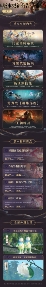 秋季大版本正式拉开序幕 诸位少侠期待已久的新江湖技能、觉醒拓展 全新图腾系统将与大家见面 更有势力战【群雄逐鹿】邀你上线一战 除此之外,重阳嘉赏有好礼 完成任务可以免费获取太初原石 话不多说,下面一起来看看 本周的更新长图吧! 本