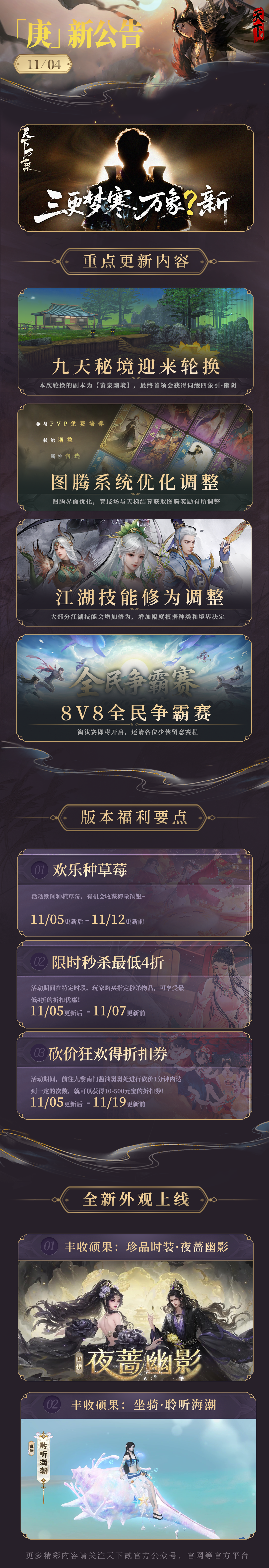 各位少侠好呀~ 本周“庚”新公告为你奉上! 九天秘境轮换的副本为【黄泉幽境】 图腾系统、江湖技能修为有所调整 备受大家瞩目的8V8全民争霸赛 即将进入淘汰赛阶段 还请各位少侠留意赛程~ 话不多说,下面一起来看看 本周的更新长图吧! 本周的更新要点到此结束~ 下滑解锁更多详情细节 以下为本周公告的全部内容 具体请以官网更新内容为准 亲爱的《天下贰》玩家: 为了保证服务器的稳定和服务质量,本周例行维护将于2025年11月05日早上8:00停机,维护时间为上午8:00至10:00左右。如果在维护期间无法完成维护内容,开机时间将继续顺延。 本次更新结束后,游戏客户端版本将从2.0.1326上升到2.0.1327,更新客户端后进入游戏。请各位玩家相互转告,并留意游戏时间,以免造成不必要的损失。对于停机期间给玩家带来的不便,敬请见谅,网易游戏感谢所有玩家的支持和配合。 三更梦寒,万象?新 老友重聚,待故人归 九天秘境 九天云动,四象交织。本周维护后各服务器的九天秘境副本会产生轮换,本次轮换的副本为黄泉幽境,同时会刷新四象之力词缀,最终首领会获得词缀四象引·幽阴。 首领获得的主要技能介绍: 1、少侠被可躲避的技能命中时将被关闭在幽境锁之中,需要队友合力击破解救。 2、时间触发技能:随着战斗的进行,首领每隔一段时间会吸引蜃华阴气向自己靠拢,首领吸收蜃华阴气后将会强化自身属性,同时蜃华阴气可以被各位少侠阻挡,这个技能的效果会随战斗时间增强。 3、首领会施展主动技能:首领会传送附近少侠至随机位置,选中其中1名少侠赋予禁锢效果,并在随后对其释放需要分摊的适中伤害,需要其他少侠靠近处理。 4、首领会施展主动技能:首领会以一定的门派优先级选择2-4名少侠,对其释放追踪气劲,气劲将在一段时间后自行消失,这个技能的效果会随战斗时间增强。 5、首领会施展主动技能:首领会召唤若干只白无常和黑无常或若干只索魂鬼,这些虚影会在被召唤时进入隐身状态,并立即发动可躲避的不可见范围伤害,需要少侠拾取清虚之气或通过其他方式破除隐身,这个技能的效果会随战斗时间增强。 图腾系统优化调整 1、图腾界面排序及显示优化:按照碎片拥有量排序,可激活的图腾显示在前 2、升到满级点击升星自动跳转到升星界面 3、可升星的卡牌增加红点提示 4、对每日通过竞技场和天下联赛结算获取图腾奖励的次数做了上限处理 答疑&回应 1、少侠反馈:部分图腾效果不满意,比如弈剑门派的应龙卡牌,需要调整。 开发组回复:收到少侠们的反馈,我们承诺将会在近期分析线上数据,并综合考虑后对图腾卡牌技能效果进行优化调整。 2、少侠反馈:PVE玩家希望能在副本中增加图腾的掉落产出。 开发组回复:收到反馈,近期将会增加图腾在副本中的掉落途径,敬请期待。 3、少侠反馈:界面显示金色图腾只在极高分段位才有投放,难以获得。 开发组回复: 1、金色图腾获取难度高,养成难度也更大一些,需要较为长期的积累培养。 2、图腾商店中可以通过紫色碎片向上兑换金色碎片,同理蓝色碎片也可向上兑换紫色碎片,有培养需求的少侠可以积累碎片前往兑换。此兑换入口本周也将改到商店首页显示。 4、少侠反馈:还没有明白图腾系统应该怎么养成。 开发组回复:少侠只需激活图腾后投入图腾灵纹升级即可,升到阶段上限后,再消耗对应碎片和瑶光梦晶升星后即可继续升级,如此循环往复。 江湖技能修为调整 本周更新后,我们会对江湖技能提供的修为进行调整。 更新后大部分江湖技能会增加修为,增加幅度根据种类和境界决定。 通过这次改动,江湖技能提供的修为将符合“境界越高,修为越高”的设定。 8V8全民争霸赛淘汰赛阶段 积分赛即将结束,请各战队注意结束时间,势力积分排行榜将在积分赛结束后结算。 淘汰赛即将开启,赛道前64强将晋级淘汰赛。 进入淘汰赛阶段,未能进入前64强的战队可在领取积分赛奖励、势力排行榜奖励后解散战队。(一定要确保奖励发放完毕后) 淘汰赛:64强晋级16强(单败) 将所有64强战队根据排名和随机因子,进行1V1对阵,可查看游戏内对阵图查看对阵信息,具体分组规则会考虑排名和一定随机性,规则细节不予公布。 淘汰赛:16强晋级4强(双败) 16强战队将分为两半区,共5轮比赛,最终角逐全服四强(赛道内),四强后进行半决赛、季军赛、决赛。 半决赛和决赛 半决赛: 2025年11月22日17时 2025年11月22日18时30分 季军赛: 2025年11月23日17时 冠军赛: 2025年11月23日18时30分 双十一庆典·饷银商城 活动时间:2025年11月5日-2025年11月19日维护前 活动内容:活动期间内,打开商城,前往集市-双11特惠页签,可享受特惠折扣购买道具;天下第一、重生服务器请进入绑定金商店购买。 熊猫刮刮乐·军资 活动时间:2025年11月5日维护后-2025年11月19日维护前 活动内容: 1、年度熊猫刮刮乐火热开启,精美时装全新亮相,机会不容错过! 2、可在熊猫刮刮乐,刮卡区自选任意一个刮卡区,点击后刮开! 3、通过点击熊猫刮刮乐右下角中的“随机刮”或“自动刮”由系统自动随机在刮卡区中刮开指定的次数。 4、每张刮刮乐,最多只有5次刮卡次数,成功刮完1张刮刮乐卡面后,可获得1张刮刮乐的票根。 5、每张刮刮乐在5次机会中,刮出2个相同图案,则获得该图案下的最大奖励面额的2倍军资奖励。 6、每张刮刮乐在5次机会中,刮出3个及以上的相同图案,则获得该