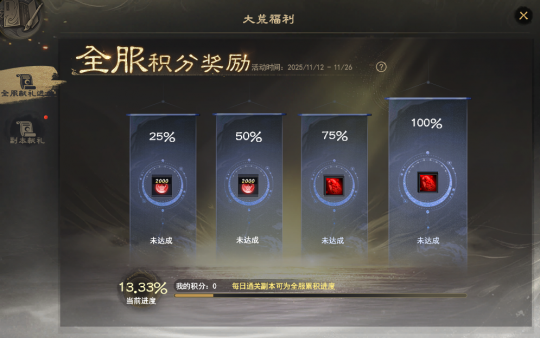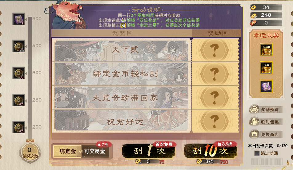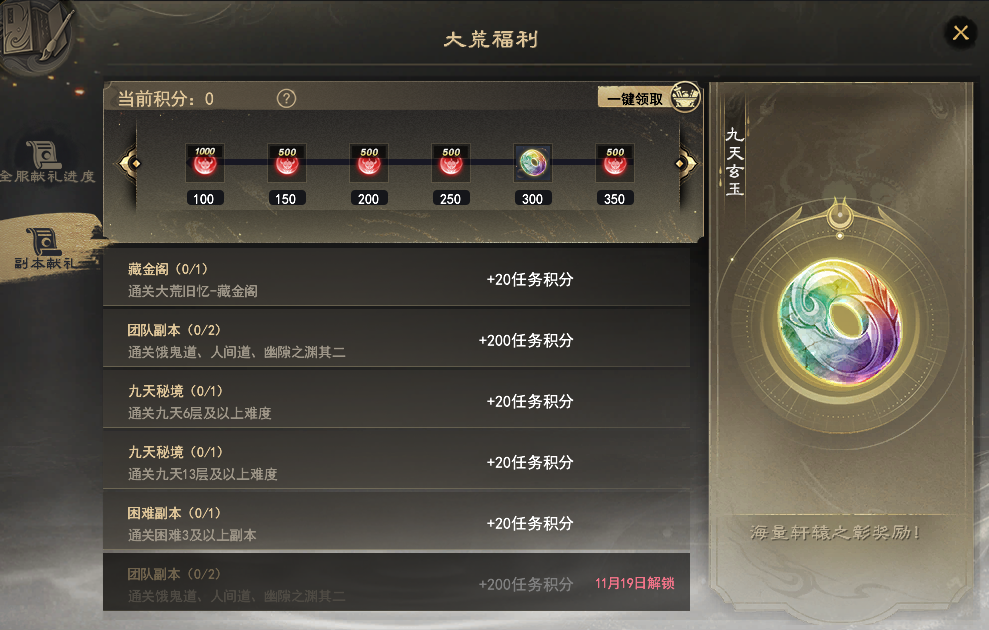 少侠们晚上好呀~ 除了一场场激情对推在大荒上演,让热衷竞技的少侠们畅享快乐,还有多重福利活动火热来袭,大家不但能体验热血战场,还可以解锁诸多奖励~ 每天登录开天即享的抽奖,升龙变礼盒、每日10份军饷(1000)待你来;【副本献礼】全民福利开启,挑战副本就可以领取九天玄玉、大量轩辕之彰等;还有善行堂活跃度抽奖,绑定金可刮的金币刮刮乐邀你来当大荒锦鲤~ 话不多说,下面一起来看看本周有什么福利活动,力将奖励一网打尽吧! 登录“开天”有赠礼 使用开天客户端登录游戏的少侠,想必都能看见KFZ发来的邮件吧~ 是的,现在每天使用开天客户端登录,都能获得一次抽奖次数哦!绝版坐骑升龙变、军饷(1000)、炼化之印、太初原石、羽灵珠、草精七彩果等好礼皆已准备好~ 只需少侠上线,轻松点点就能有机会把诸多奖励收入囊中! 日常活跃,善行堂抽好礼 大荒的福利远不止于此~备受大家喜爱的善行堂活跃度抽奖活动回归,邀你上线来当大荒欧皇啦! 即日起至12月9日,少侠日常活跃便可以在势力善行堂分堂进行抽奖!抽奖活动分为多期,每一期分为累积与抽奖阶段。 只需每日活跃度达到100点,便可累计获得1次抽奖次数,每期每位少侠最多可抽取7次哦~每一期势力全员累积的日常活跃度越多,那么大家可抽取的奖励就越高!雷钻、太初原石、凝气神符、五帝本纪·高、军饷全有,还有不知道此等福利的少侠吗?快快转发到势力群里号召大家努力起来吧~ 想要参与带走奖励的少侠,记得留意下活动日常哦~ 第一期: 累积阶段:即日起至11月25日23:59; 抽奖阶段:11月26日8:0012月2日23:59 第二期: 累积阶段:11月26日8:0012月2日23:59; 抽奖阶段:12月3日8:0012月9日23:594.活动奖励:本次活动根据势力全员每期累积的日常活跃度进行奖励发放。 副本献礼,全民福利 给各位热爱PVE玩法的少侠划重点:副本献礼活动正在进行中!无论是日常副本、团队副本,还是困难本、九天秘境,少侠都能通过打副本累计积分,带走珍稀培养道具!轩辕之彰、九天玄玉轻轻松松就能拥有~ 打副本还能为本服务器加速,达到对应进度时,累计提供积分达到200点的少侠可以领取普发的大量轩辕之彰、九天朱砂道具奖励! 金币刮刮乐,绑定金可带走丰富奖励 绑定金币轻松刮,大荒奇珍带回家! 活动期间,少侠使用绑定金或可交易金进行刮奖,每次刮奖都可以收获奖品!使用可交易金还能享受额外折扣,首次单抽免费,首次10连5折哦~ 8888绑定金、五帝本纪·高、雷音溟钻、百元圣丹·高、草精七彩果等奖励应有尽有,其中还有刮刮乐专属外观代币霓裳金元,前往珍品商店可以兑换诸多精美外观! |