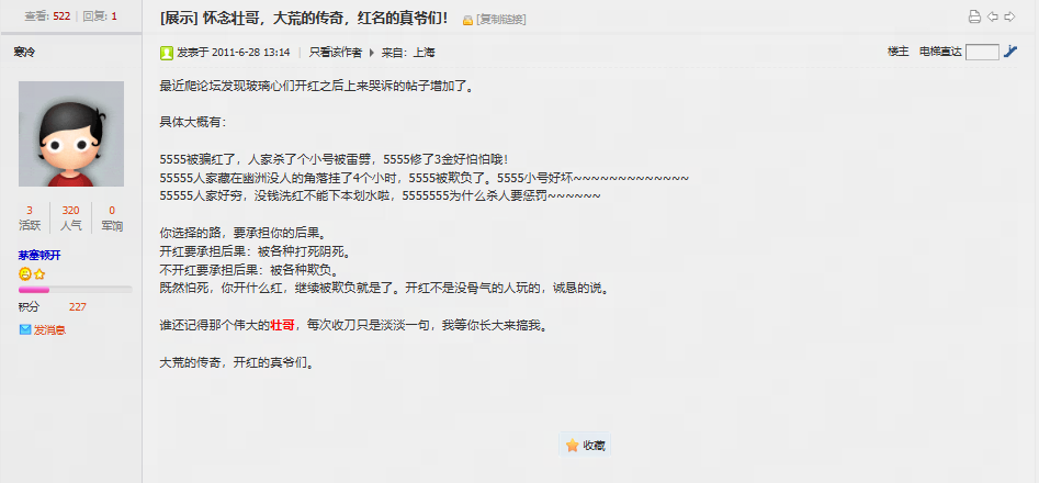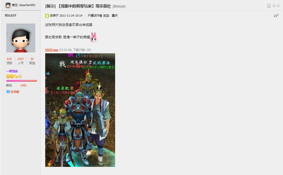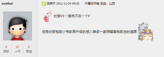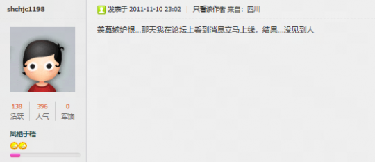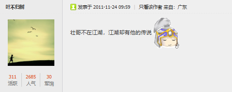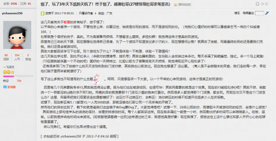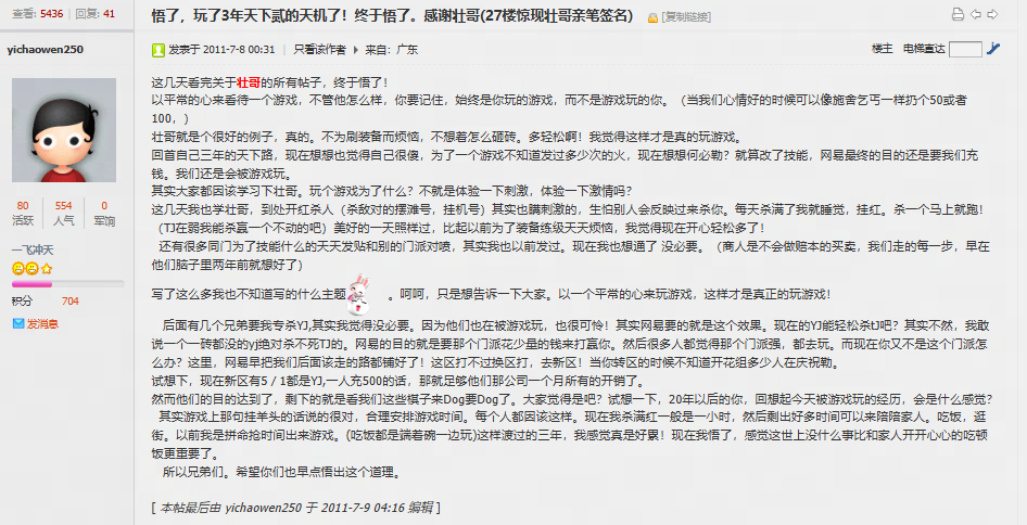 “哥是为了让你体会社会的险恶,等你长大了,来找哥报仇。”这句话,是否让少侠们心头一动,仿佛又看见八卦田上的那个身影? 想必不少老玩家已经想起了那个在大荒留下传说的男人——来自【天府之国】服务器的天机少侠【现实很壮】。因常年专注于“教育”小号而闻名天下的他,又被大家亲切地称为“壮哥”。 无论你是否曾是他的“刀下魂”,还是只闻其名的旁观者,或者只是在后来道听途说过他的故事,今天都可以跟随小天天来看看本期大荒故人旧闻,让我们根据当年保存下来的信息,了解现实很壮少侠在大荒的曾经吧~ 从“萌新公敌”到名震大荒的“风云人物” 在多年之前的大荒,八卦田处总有个伟岸的身影徘徊四周,他身穿天机45套装备,手执九环刀,一年三百六十五天坚守在黄泉幽境副本的门口,只为身体力行“教育”各路萌新小号。每当刀下“怨魂”咬牙切齿地问起原因时,他都会轻飘飘地留下一句:“哥是为了让你体会社会的险恶,等你长大了,来找哥报仇。” 在那个人均萌新的大荒,很壮少侠长年累月地坚持着一件事,那就是:为每一个路过的小号,上一堂名为“社会险恶”的实践课。据说当时的萌资讯风丧胆,甚至不敢独自一人经过很壮经常出没的八卦田、西陵城等地,不巧碰上也只能自认倒霉,暗下决心努力升级后来雪耻。一开始这种行为让很壮少侠宛如过街老鼠般人人喊打,若当时有个“萌新讨厌榜”,很壮少侠必定榜上有名。 然而到后来,出人意料的是,随着时间推移,事情却发生了变化。 因为很壮少侠数年如一日的执着,以及颇具个人风格的行事作风——那独树一帜的“教育理念”,让其火爆天下论坛,成为了诸位大荒少侠热议的焦点。 很壮从一个人人见而诛之的“萌新公敌”,竟然变成了名震大荒的“风云人物”,甚至被不少人称之为“偶像”。 越来越多少侠因为很壮的坚持而心生钦佩之情,论坛上也有许多关于很壮的关注与讨论—— “壮哥威武~” “偶遇偶像,现实很壮!” “有幸被壮哥秒过~” …… 许多小伙伴还给很壮起了不少威风的名号:“跨服野终结者”、“中原第二守卫”等,甚至有不少人前往很壮经常出没得西陵城、黄泉副本门口蹲守,他们不为竞技比拼,也不是为萌新报仇,只为能与他合影一张,甚至有人主动给很壮献上人头,只为听他一句:“等你长大来报仇。” 很壮少侠常用的九环刀,也让一众“迷弟迷妹”传阅,耐久度为0以及刀上的刻字“这把刀对我来说就是我的生命!”,都象征着很壮名震天下的战绩。 在少侠们一字一句的描述里,很壮的形象逐渐变成行走大荒的潇洒杀手:最广为流传的是他坐在西陵城的石头上休息的时候,大家聚在一起闲话家常,随口问起很壮怎么不去教育小号了,他在频道上悠悠说道:“抽完这支烟就开工。” 轻描淡写一句话,却让众人莫名有种“被帅到”的感觉,感叹一句:“壮哥,真乃神人也。” 时光无情,大荒有情! 他是当年青春的见证人 爱他者视作一代风云,厌他者始终鄙夷,有人崇拜很壮的坚持,自然也有人对很壮表示不屑,时至今日仍有不少人对他开红小号的行为感到不满。但不可否认的是,大家每每在论坛、大神、贴吧提起当年在大荒耳熟能详的名字时,总有人提名很壮少侠,也总有人在后面跟帖,翻出藏在QQ空间里的九环刀截图,感叹当年青春热血。 我们回忆很壮少侠,并不是推崇他的行为,或许更多的只是怀念当年与之一起游历大荒的青春,很壮的存在本身,就是大荒里一道另类独特的风景线。 怀念着当年还是天下贰萌新的自己,怀念着与师傅、亲友们骑着小白马驰骋燕丘草原的时光,那段每天无忧无虑上线游戏的青春…… 以上素材来源皆为网络 |