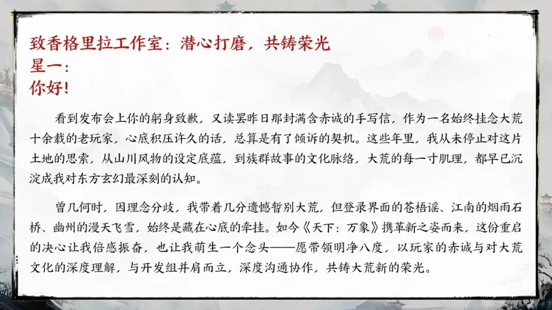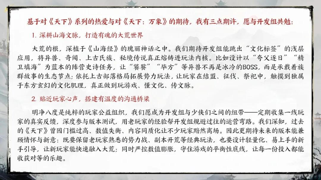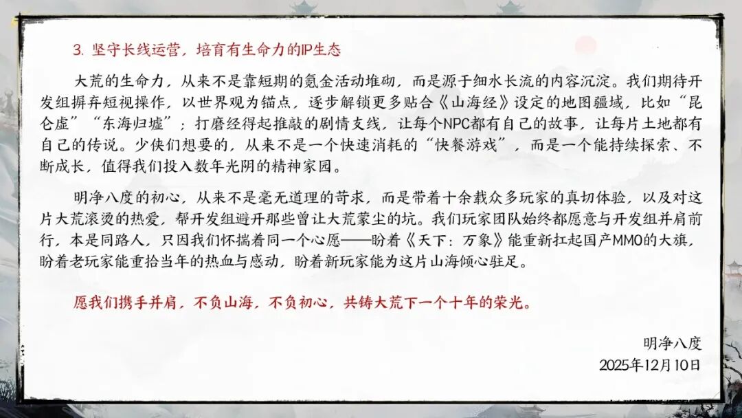 少侠,你还记得【明净八度】吗? 作为天下最初期的玩家团队之一,他们产出的各类玩法攻略、势力战报,如今仍是不少少侠常常重温的存在。 而作为明净八度的创始人,明度更是许多少侠心中的“初代大神”。成門羿蒼龍、逐日铭……这些你熟悉的名号,也都是他。 在昨天制作人星一给少侠的手写信以后,就在刚刚,我们也收到了来自【明净八度】的信件,字里行间无一包含着对天下最深切的爱,对大荒未来的期待。 【明净八度】不仅仅是一个玩家团体,更是无数热爱着天下的玩家的缩影,相信这封信的字字句句,其实也是每位关注并支持着天下的少侠们的肺腑之言。 《山海经》是天下的根基,也正因我们有如此优秀、丰富的底蕴,才能创作出各种荡气回肠的主线与深受大家喜爱的人气角色;未来我们也定会深耕于此,探求让天下更有生命力的运营方向。 现如今,《天下:万象》的上线时间逼近,我们也和各位少侠一同期待着,在弥赛亚引擎的加持下,开启天下全新的时代,未来,我们会让天下玩家拥有一段美好的第二人生。 这一次,我们以新引擎、新场景、新捏脸等一系列全新体验为引,为天下注入全新的活力,也希望能够为关注和热爱天下已久的你,带来截然不同的感受。 这一次,在建设天下未来的路上,我们会始终与广大少侠携手并肩、保持紧密的沟通,不负山海、不负初心。 欢迎少侠与我们一同前行,共同书写大荒下一个十年的故事,共铸天下荣光! 少侠,欢迎回家! |