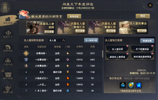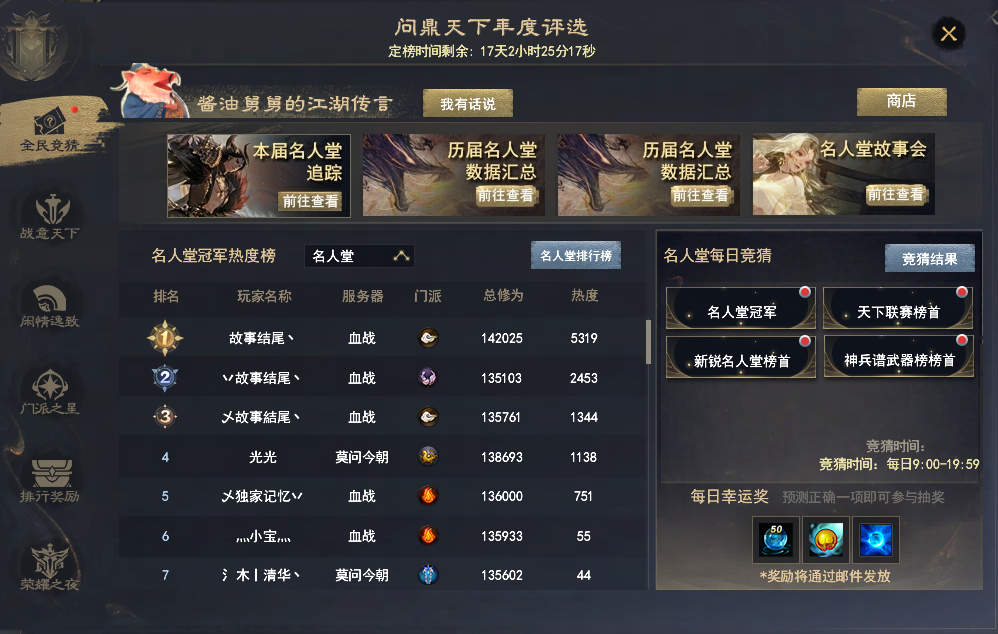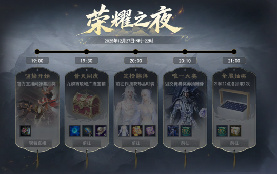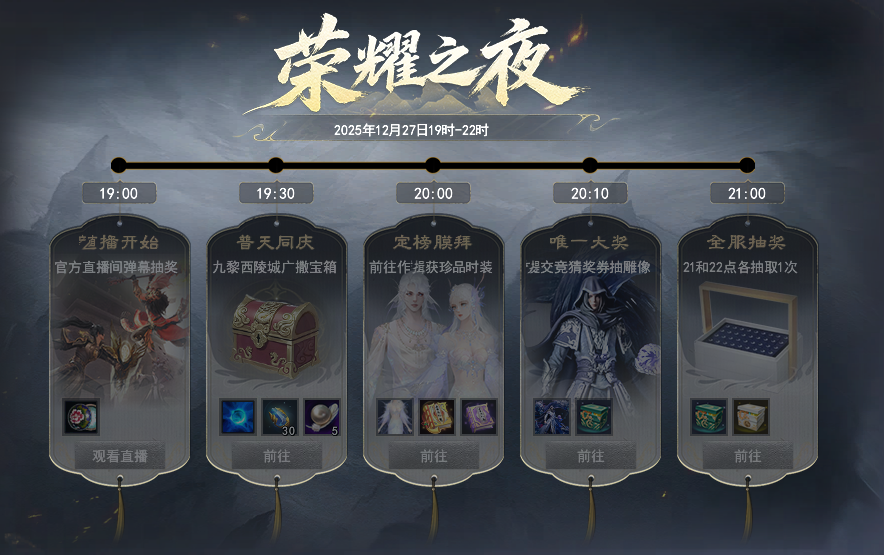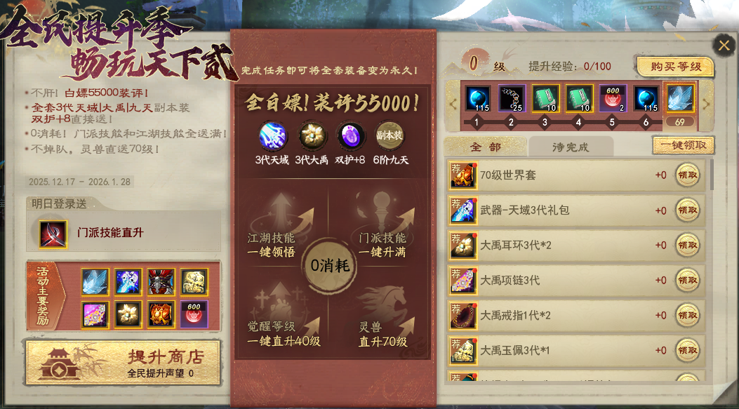 少侠们晚上好呀~ 三端互通的《天下:万象》全平台上线,公测首日便斩获了游戏总榜的第三名,各位新朋旧识纷纷奔赴大荒,见证这划时代的一刻,体验升级过后的崭新天下。 除了海量公测福利,还有广受好评的【全民提升季】限时回归!不肝不氪,轻松解锁55000装评,三代天域、大禹、九天副本套直接赠送!门派技能、江湖技能全送满,灵兽直送70级,此刻正是追赶大部队的绝佳时机! 不仅如此,每日开放的名人堂竞猜、天降豪礼的荣耀之夜、限时回归的童年雪场,更有可免费获取的武魂等丰厚奖励……不管你是刚刚回归,还是活跃已久的少侠,都前来大荒体验纷呈乐趣!话不多说,快来一探究竟吧~ 回归无烦恼!55000装评白嫖有 自《天下:万象》上线的消息曝出,就吸引了许多少侠的目光,不少暂离大荒的少侠因此回归,再续天下之缘。不过,部分踌躇的少侠有所担忧:“离开许久,还能跟上大家的进度吗?” 为少侠排忧,《天下:万象》焕新开启之余,备受大家喜爱的活动【全民提升季】也同步来袭,给各位想要快速升级成长的少侠,可以仅通过日常、竞技场、下副本等任务,以低成本的方式获取珍稀装备,白嫖55000装评! 天域、大禹、九天套 天域3代、大禹首饰、70级世界套上线即领!这些自带炼护、加护、初始炼化的装备,参与全民提升季至第31天活动,就可以免费升级永久! 除了这些,我们还给各位想要参与PVE玩法的少侠准备了六阶九天套,同样只要参与提升季便能免费升级为永久~ 大量炼化、轩辕之彰 日常参与全民提升季,少侠还能累积诸多活动声望,前往【提升商店】兑换炼化之印、神农秘药等道具~ 随着参与进程的深入,提升经验也会随之上涨,经验越多,少侠能解锁的奖励就越丰厚!五帝本纪、轩辕之彰,还有雅致翅膀【纤云凝碧·蓝】都可以免费拿下! 群雄竞逐!每日竞猜赢好礼 每年必随评比来袭的全民竞猜活动,亦如火如荼进行中!年度评比开启,正是群雄竞逐之时。在激烈的比拼之中,少侠是否有看好的选手呢? 每日9点-19点59点,少侠都可以打开竞猜界面参与,预测正确可以收获积分,当积分累计到一定数量时,可以解锁对应的奖励哦~万象天下声望,概率开出炼化之印、嘉年华坐骑的嘉年华福宝礼包,玉玑子超级实体雕像抽奖券,都可以通过竞猜领取哦~ 只要预测正确一项的少侠,就还可以参与抽奖,玄幻之壁、百元圣丹·究、五帝本纪·高、2000军饷等皆有,或许下一个获得每日幸运奖的锦鲤就是你! 凛冬已至!打雪仗,品童趣~ 深冬渐寒,岂能缺少一场酣畅淋漓的雪仗?【童年雪场】限时回归,少侠是时候来大荒感受以下童年打雪仗的乐趣啦~前往九黎南门处的NPC【休闲雪战】处即可报名参与,进入战场后便能与小伙伴们驰骋于白雪皑皑的雪地中,与对面的“小朋友”一决高下。赢得胜利后,少侠便可以领取声望,兑换丰富好礼哦~ 除此之外,在雪场里表现优异的少侠,若在排行榜上名列前茅,还能额外领取不少声望奖励! 岁末奖赏,双周任务领奖励 正值嘉年华之期,岁末嘉赏亦来为这热烈的氛围添上一把火~少侠上线,可别忘了顺手做做任务,领好礼!只要在线挂挂机、完成活动、或者战场·协作等,便可以完成~所有任务完成后还有领取额外的【岁末嘉赏宝箱】! 嘉年华商店盛大开业 上文一直提到的声望【万象天下】,究竟可以帮助我们带走什么奖励?这就来给少侠们说道说道~ 前往【问鼎天下】商店,少侠即可使用参与活动赢得的声望,兑换丰富好礼:雷钻、月钻、百元圣丹、羽灵珠、草精七彩、炼化之印、阴阳碎片、太初原石应有尽有,甚至精美时装【星芒坠矜】、武魂【以德服人】、【以理服人】也能凭借声望免费带走!心动的少侠不妨赶快上线参与活动,累计声望拿下诸多福利吧~ 荣耀之夜,天降万千豪礼 每年定榜的时候,相信都是天下少侠最为期待的时刻,不仅可与伙伴们见证评比结果,还有海量福利派送!当然了,今年的定榜也不例外~12月27日19时,【荣耀之夜】直播将如约而至,届时前来参与狂欢,还有玉玑子 1/4实体雕像 、天下·15周年纪念麻将、珍品时装、北溟危途绝版虚拟礼盒、天下“星罗棋布”纪念版礼盒、天下贰·大荒谣-纪念黑胶唱片等奖励! 12月27日,我们不见不散~ |