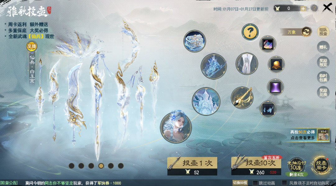 少侠们晚上好呀~ 今日活跃,可有领取到腊八材料包,收获丰富好礼 上线后可在活跃度100宝箱里领取到腊八材料包,使用这些道具合成【腊八粥】后,有机会获得五帝本纪·初、五帝本纪·中、轩辕之彰等节日奖励,少侠可不要忘记这一福利哟~ 腊八将至,年味渐浓。转眼间天下与大家已携手走过十余载光阴,天下官方论坛也陪伴我们走过了无数充满热血与温情的日子。 新的一年里大荒也迎来了新气象。前段时间,全新武魂【仙兵】·白玉京现世大荒,同时也带来全新特效,为少侠的一招一式加持神龙光辉,凛冽寒冰! 【终结特效-流风回雪】凡执此仙兵击杀敌方,可将其瞬间冰封,刹那间崩碎如玉屑纷飞; 【武器尺寸巨大化-力挽天倾】形如千斤巨擘,难以驾驭。唯有真仙人,方可举重若轻; 【待机游龙特效-惊鸿照影】玉龙环绕,仿若惊鸿; 【可穿戴其他门派武魂-天罚】:窥伺天机,可无门槛穿戴其他门派白玉京武魂,传说中集齐9个门派白玉京武魂后可进阶。 【仙兵】·白玉京可通过雅歌投壶玩法获取,本期投壶拥有先抽后付、周卡返利、首次十连5折、多重保底等多重福利~感兴趣的少侠记得在活动期间参与,把这一以冰雪化成的神器收入囊中哦! 话不多说,下面一起来欣赏【仙兵】·白玉京系列的部分武魂,剩余的五款武魂将在下一期奉上~ 白玉京·扶摇扇 冰扇引澜,深藏玉魄 扇骨由冰晶与金甲雕琢而成 两条栩栩如生的玉龙盘旋其中 口吐琥珀宝珠,熠熠生辉 长短不一的薄羽覆盖为扇面 挥合时溢彩流光,冰雾缓缓溢出 既具有疗愈之温润 又增添几分清冽之感 白玉京·含光剑 剑缠龙霜,刃映天池 千年不化的寒冰铸成含光剑 通透如琉璃,整体嵌有金甲点缀 绝尘又不失矜贵 剑柄末端雕琢成龙首造型 龙角冰凝,泛着银白光泽 嘴衔一枚圆润宝珠 霜雪随长剑倾泻流转 挥剑时定神气非凡! 白玉京·新月弓 冰弓衔月,箭破寒空 新月弓凝冰为骨,缠霜为弦 玄冰制成的弓身弧度优美 绘出双龙于云中嬉戏之象 弓臂处雕琢的龙鳞 在光线下折射出光芒,更显威武 如冰箭矢划破冷夜 令人心生阵阵寒气 白玉京·逆鳞刺 冰刃藏影,锋裹神龙 逆鳞刺看似剔透晶莹 实则锋锐无比 刃身形如弯月 精美的祥云纹路汇聚 散发着淡淡寒意 薄如蝉翼的冰羽极仅优雅 把柄处神龙盘旋,伴有金光流转 挥舞双刃时寒气四溢 威力不容小觑 以上就是今日关于 全新武魂【仙兵】·白玉京的展示 感兴趣的少侠可以上线参与投壶 享受先抽后付、周卡返利 首次十连5折、多重保底等多重福利 拿下心仪武魂~ |