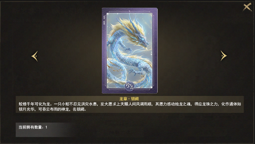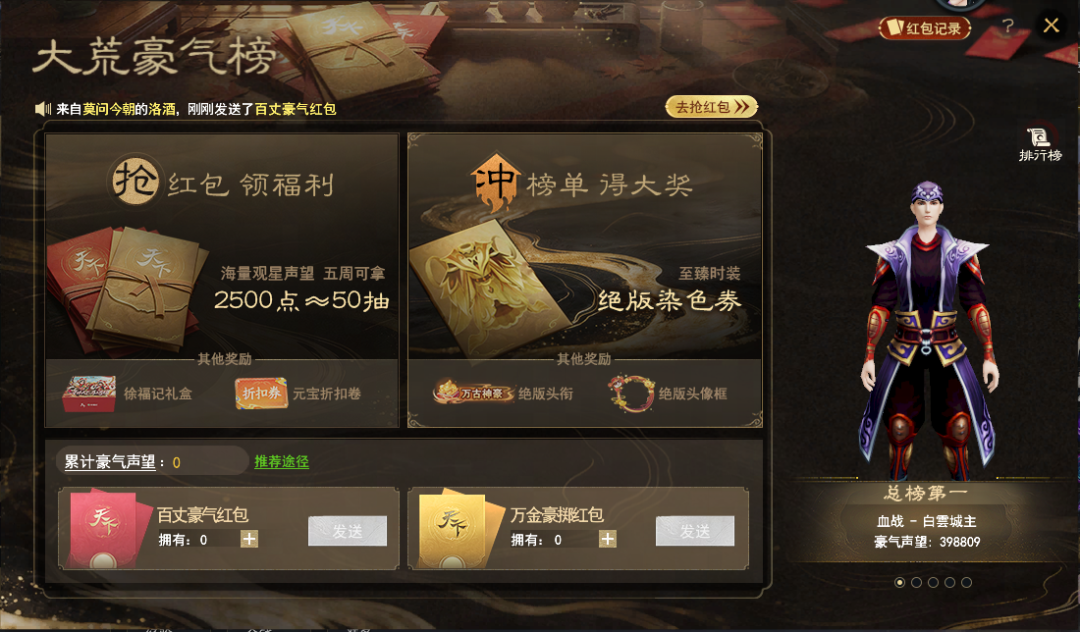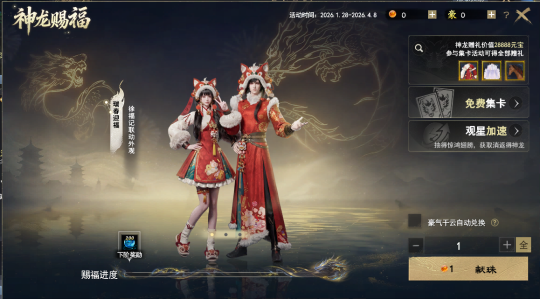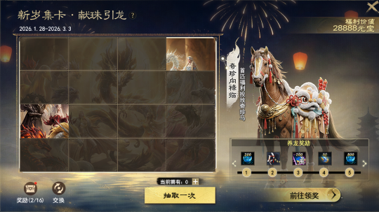 少侠们晚上好呀~ 临近新春佳节,【骏启瑞年】版本今日上线,为各位少侠奉上新春祝福与一大波春节好礼! 签到即可领的永久时装【瑞雪迎春】,活跃可得的神龙坐骑、奇珍马【向禄临马】、永久妙品时装【紫绡蝶梦】,大量炼化之灵、太初原石、百元圣丹等珍稀材料……想要知道如何获取,将诸多福利收入囊中吗?那就跟着小天天接着往下看看吧~ 神龙赐福,献珠得奇珍马 新一年的好运气,就从大荒开始吧~趁此新年新版本【骏启瑞年】,我们给少侠们准备了全新神龙坐骑、首匹福利投放的奇珍马、徐福记联动时装、永久妙品时装等好礼~这些福利皆可通过神龙赐福活动获取,少侠只需献珠即可累计赐福进度,领取对应的奖励! 除了上述大奖,还有炼化之灵、大禹之恩、太初原石、虬龙明珠/觉醒经验丹/凝气神符、新春饰件等奖品待你解锁~ 那么,我们要如何获取献珠所需的道具【如意龙珠】呢?少侠既可通过消费元宝获得豪气干云声望,代替龙珠进行献珠操作(每50点豪气干云声望相当于1颗龙珠),又可通过参与集卡、签到等免费获取龙珠哦~ 献珠引龙,集卡领好礼 新岁来袭,神龙降福。每天首次登录游戏、在线30分钟、完成60活跃度、100活跃度都可获得一次抽卡次数,可以随机抽取卡片。 在抽取的过程中,达到成就能获得对应数量的龙珠奖励,集齐16张卡片时还能解锁200颗龙珠!若没抽到心仪卡牌,还能与其他少侠交换卡牌,更利于集齐卡牌,收获更多奖励~ 每日签到,永久时装免费领 每年必到的春节签到福利如期而至!动动手指就能收获宝箱奖励,每周一、周四至周日,都可收获一马当先宝箱,积攒瑞马迎春节日声望。前往道具商城-集市-福利可使用节日声望兑换炼化之印、五帝本纪·初、五帝本纪·中、百元圣丹·中、羽灵珠、太初原石等奖励哦! 而每周二、周三,少侠可签到收获马到功成宝箱,必得前文所述的道具【如意龙珠】,概率开出羽灵珠、炼化之印、称谓升级券~ 除此之外,累计签到还能额外解锁奖励!累签10天、18天、25天时就能拿下【瑞雪迎春】永久时装、炼化之印、绑定金、羽灵珠、事迹·马岁马争先等好礼啦~ 驱逐年兽,获宝箱奖励 新年将至,调皮的年兽蠢蠢欲动,又来大荒“搞破坏”,少侠快来把它们赶走吧! 每天12:30、19:30、20:30、21:30、22:30,年兽都会在大荒各地出现,少侠可以在地图上看到对应标志,寻路至指定地点即可看见年兽。 驱赶年兽还能获得丰富好礼:每日首次击杀年兽能获得节日声望,成功驱逐年兽后还有金元宝宝箱洒落四周,各位少侠届时可以留意一下哦~ 豪气干云!抢红包,领福利 前文提到的豪气干云声望,除了能代替龙珠进行献珠操作,当累计到一定数量时,还会解锁对应档次的红包,少侠可前往活动界面给大家主动发放,感兴趣的少侠还可以参与排行榜,拿下绝版染色券、头像框、头衔! 除此之外,符合条件的少侠参与抢红包,有机会把观星声望、徐福记礼盒、元宝折扣券带走哦!快快上线,抢红包,当锦鲤吧~ 每日活跃,新春献好礼 当然了,福利远不止以上这些~ 现在活跃于大荒,还可在活跃度宝箱里收获到额外的新春好礼哦!少侠每日登录并完成活跃度30、60、100任务,可获得时光灵气、五帝本纪·中等好礼。开启100活跃度宝箱,还可以领取新春材料包,打开可以随机获得纸、墨、笔道具。使用道具能合成春联,有机会获得五帝本纪·初、五帝本纪·中、轩辕之彰、百元圣丹·普哦! |
