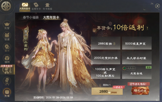 《天下:万象》12 月 17 日全平台上线,三端互通畅玩大荒! 各位少侠晚上好呀~ 春节版本【骏启瑞年】已上线 除了有永久奇珍马、妙品时装等 福利好礼可以免费带走外 首张【大荒年货卡】也正式上架 这张年货卡可谓是2026年的性价比之王 高品质永久珍品时装首次直售 解锁更可得高价值等额军饷 5000点观