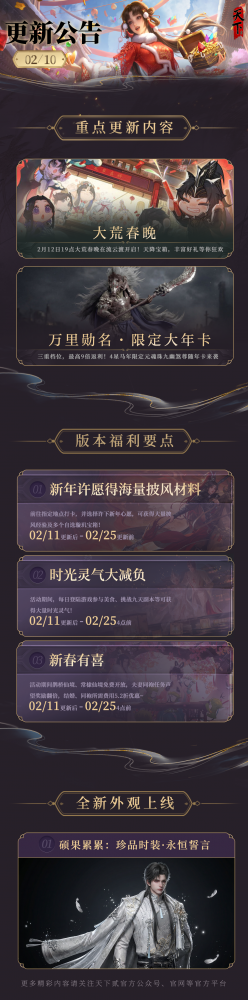 少侠们晚上好呀~ 又到了本周的更新时间 新年将至,大荒与你庆佳节! 2月12日晚大荒春晚开启 邀你看直播,领取大量好礼 还有马年限定大年卡 携4星九幽煞尊元魂珠来袭 同时还有时光灵气、披风材料放送 话不多说,下面一起来看看 本周的更新长图吧~ 本周的更新要点到此结束~ 下滑解锁更多详情细节 以下为本周公告的全部内容 具体请以官网更新内容为准 亲爱的《天下贰》玩家: 为了保证服务器的稳定和服务质量,本周例行维护将于2026年2月11日早上8:00停机,维护时间为上午8:00至10:00左右。如果在维护期间无法完成维护内容,开机时间将继续顺延。 本次更新结束后,游戏客户端版本将从2.0.1345上升到2.0.1346,更新客户端后进入游戏。请各位玩家相互转告,并留意游戏时间,以免造成不必要的损失。对于停机期间给玩家带来的不便,敬请见谅,网易游戏感谢所有玩家的支持和配合。 大荒春晚 活动时间:2026年2月12日19:00 四海欢腾迎新岁,马到功成贺大荒!大荒春晚将于2月12日19点准时在江南流云渡举行,少侠们可不要错过哦! 活动期间多重好礼相送: 1.天降宝箱:20:10-21:10,大荒将天降所有人可领取的“大荒春晚福利宝匣”,每10分钟掉落一波,总共7波,少侠们赶紧来领取吧! 2.全民抢宝箱:在20:05-21:05期间,流云渡码头附近每隔15分钟将掉落大荒好礼宝箱,总共掉落5波,抢到宝箱的少侠不仅会获得奖励,还会获得一些特殊的状态哦! 3.看直播,拿好礼:2月12日19点,前往CC、抖音官方直播间,或通过游戏右上角易玩团入口观看大荒春晚直播,各种精彩内容等你来看,同时,直播中会掉落口令红包,少侠可前往新激活码界面进行兑换,总共会有4个口令,同一口令每个玩家只可兑换一次,口令过期时间为2026年2月12日24:00。 万里勋名·限定大年卡 限定大年卡 活动时间:2026年2月11日更新维护后——2026年3月10日 活动内容: 马年大年卡-万里勋名将限时上线,包含禄和、虎尊、龙玺三重档位,最高9倍返利,购买虎尊和龙玺大年卡将可以获得可交易的4星马年限定元魂珠——九幽煞尊。 九幽煞尊元魂珠 定位:冲阵战士 初始星级:4星,可消耗4星九幽煞尊进阶至5星。 九幽煞尊初始等级即为80级,无法喂食化雪丹和聚能精魄丹。在首次获得时随机生成六维属性,并可用九幽煞尊碎片对基础属性进行洗炼, 进阶至5星时基础属性按当前比例增加。 九幽煞尊只能用于幻化,无法激活或使用合体。 九幽煞尊技能介绍: 进阶至5星后,九幽煞尊额外获得以下技能: 【新年许愿】得海量披风材料! 大荒新岁,龙马精神!2月11日至24日,前往指定地点打卡,并选择许下新年心愿,可获得大量披风经验及多个自选璇玑宝箱!完成全部9次打卡更可获得9枚高级自选璇玑!此外,少侠还可选择拍摄自己的年度照片留作纪念,可与好友在大荒许下新年心愿,共同拍摄团年照片! 硕果累累 丰收硕果献好礼 商城将限时上架捕梦网道具,玩家可于商城-热卖中花费元宝购买捕梦网,参与活动! 活动时间:2月11日更新后至3月4日更新维护前 活动规则: 1.丰收果树上每层都有若干奖励道具,使用商城购买的捕梦网可以摘取果树上的果子,果子分为金梦果和醉梦果; 2.每次摘取后可以从该层剩下的果子里继续摘取,本层的果子摘取完毕后才可摘取下一层的果子; 3.如果摘取到金色的金梦果,则可以同时拿完这一层的所有奖励道具,并且进入下一层,本期活动共计14层。 活动奖励: 珍品时装·永恒誓言、坐骑·爱在破晓、观星声望等 时光灵气·大减负! 开启区服:所有服务器 活动时间:2026.2.11~2026.2.24 活动内容:活动期间参与活动即可免费获得大量时光灵气 (1)每日登陆游戏,所有少侠即可通过大荒福利界面即可领取时光灵气(500)*1,18000以上修为可使用该道具 (2)通关任意难度九天秘境副本(无论单人或组队均可),即可领取时光灵气(400)*1,18000以上修为可使用该道具 每日总计可得时光灵气*900,少侠可以通过活动日程内的时光宝盒,一键完成师门、大荒美食谱、祈福补天任务。 新春有喜 活动时间:2026年2月11日维护后-2026年2月25日维护前 活动玩法:活动期间,鹊桥仙境、常棣仙境免费开放。夫妻同袍任务声望奖励翻倍。结婚、同袍所需费用5.2折优惠,商城婚庆类相关道具在特惠页面下5.2折出售。 促销道具如下:情定三生、情深义重、情深似海、情动大荒、红线、长相思、镶金双喜红贴、婚庆礼炮·并蒂荣华、婚庆礼炮·天作之合、烫金龙凤包装纸、改名换姓、再世为人、祥凤(新娘凤冠)、祥凤(新娘霞帔)、乘龙(新郎礼冠)、乘龙(新郎礼服)、易容卷·万化、彼岸之忆。 浑仪问星上新 活动时间 2026年2月11日更新维护后至2026年3月4日更新前 活动内容 限时上新: 浑仪问星限时上架两款绝版发色: 表现主义·酷儿、表现主义·怒潮 前三次小奇珍奖励必定为此三款发色 注:天下第一服务器、重生服务器不开启此活动。 体验优化 天下万象优化 1、修复了在切换背包时装备页面会连续刷新的问题。 2、优化了戒指、手镯等类型道具位置显示。 3、优化了设备绑定提示。 4、优化了觉醒经验每日提示红点。 5、新增了多版本资源删除功能,可以手动选择删除不再游玩的版本资源。 6、优化了道具装配流程,现在可以直接在主界面的道具栏选择装配道具了。 风华名人堂 更新全新风华翅膀奖励预览。 |