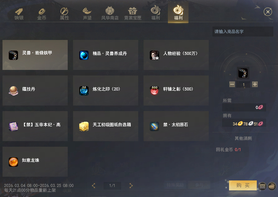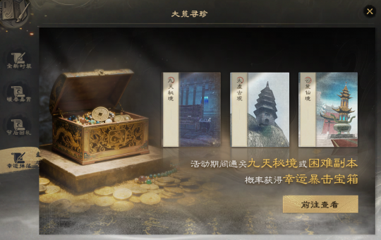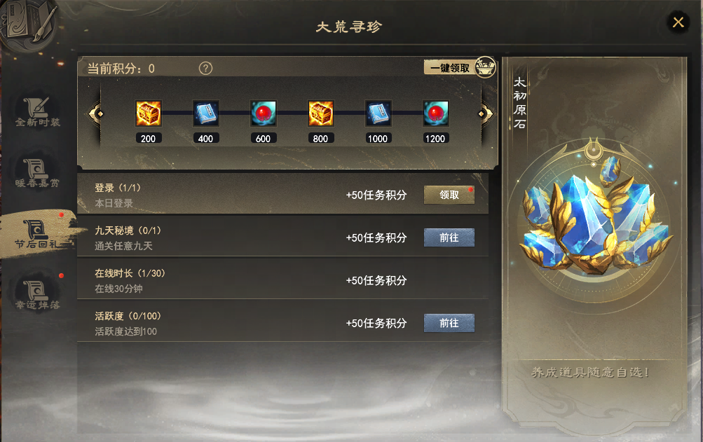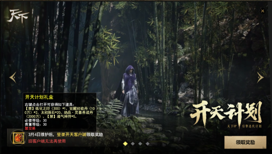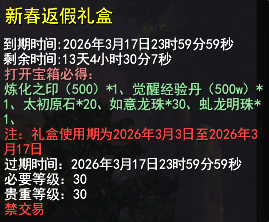 少侠们晚上好呀~ 随着阖家团圆的元宵节过去,就算正式过完年了,时间飞逝,转眼就到了打开之前KFZ派发的【新春返假礼盒】的日子啦~少侠记得及时打开,领取礼盒里的炼化之印、太初原石等奖励哟! 这个日新月异的大荒,也迎来了许多新鲜事物,陪伴各位少侠快乐游山海。除了新上线的数款春日时装,还有开天计划、节后回礼、禹王恩泽雨、4V4论剑天下等活动待你参与,拿走相应福利!话不多说,下面一起来看看吧! 开天计划,登录领取价值1500元宝礼包 开天全启,天下焕新!感谢BigWorld引擎,让我们相遇山海,共度十八载。 但如今为了让你看到更广阔的大荒,我们不得不重新启程。 3月11日,开天客户端将全面启用,为感谢少侠的一路相随,现在登录开天客户端,即可领取价值1500元宝的专属福利礼包~炼化之印、觉醒经验丹、太初原石等丰富好礼皆有,少侠可不要忘记前来领取哦! 珍稀道具免费有!节后回礼助力养成 热闹欢乐的假期过去,养精蓄锐之后,正是少侠们卯起劲进行培养的好时机!现在参与【大荒寻珍】里上新的【节后回礼】,便可以仅凭活跃——登录、挂机、通关九天副本等,就能获取到任务积分,把大禹之恩、轩辕之彰、五帝本纪、百元圣丹等珍稀培养材料。当然,少侠亦可选择回礼金币后前往道具商城-集市-福利的兑换商店处,自由选择心仪的道具~不想落下成长进度的少侠,快快上线行动起来吧! 禹王恩泽雨,挂机得大禹声望 福利远不止这些~3月6日-8日,每日13-15点以及每晚20-22点,少侠在线挂机即可以免费获得大禹之恩声望,每1分钟可获得10点大禹声望,最高可得720点!什么都不用操作,只需少侠上线即可!本次福利活动持续3天,少侠可根据自己的规划灵活分配时间哦~ 标准号赛事,全民同台竞技 节后回大荒,相信不少少侠都摩拳擦掌,想要上场竞技,看看新一年的战力是否有精进~ 4V4论剑天下竞技赛,启用标准号模式,月卡服与传统服的少侠可以组队或者对抗,真正实现全民同台竞技!少侠可以制作标准号,与其他服务器的的好友共同参赛。尚未组队的少侠也可以通过招募平台进入队伍。 赛事动态称谓、荣誉徽章、头衔、坐骑等尊贵奖品皆已准备好,就等诸位英豪参赛夺下! 挑战副本,幸运宝箱掉落 各位PVE玩法爱好者的福利也已上线~活动期间,每日只要如往常般挑战困难本、九天本,就有机会获取掉落的幸运暴击宝箱,打开宝箱,可以有概率获得霓裳宝匣,开出妙品时装【玉昙浮盏】! 大家打副本的时候不妨多多留意下,说不定下一个拿到时装的幸运儿就是你~ |